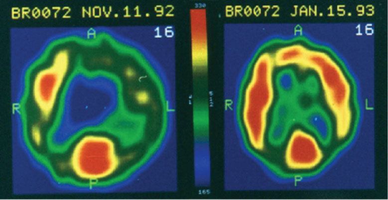 It is clearly to see the cerebral improvement in cerebral ischemia after 36 hours HHT therapy on senile dementia patient through comparing the tomographic slices of Pre-HHT and post HHT.